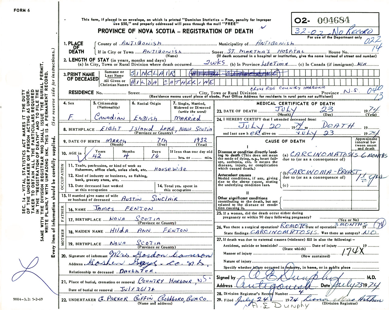 Female Death Registration: Year: 1974 number: 4684
