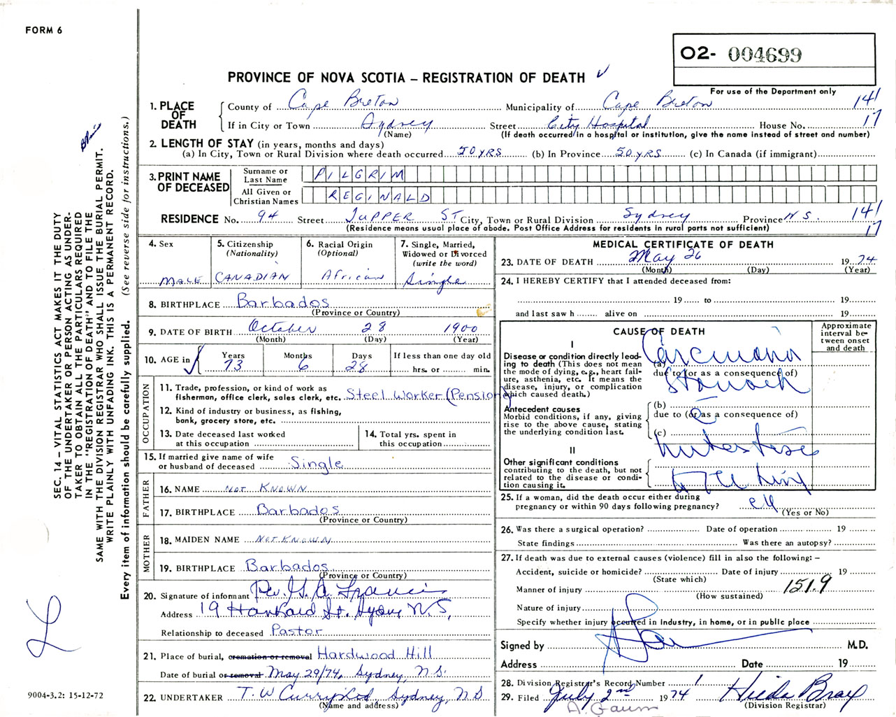 Male Death Registration: Year: 1974 number: 4699
