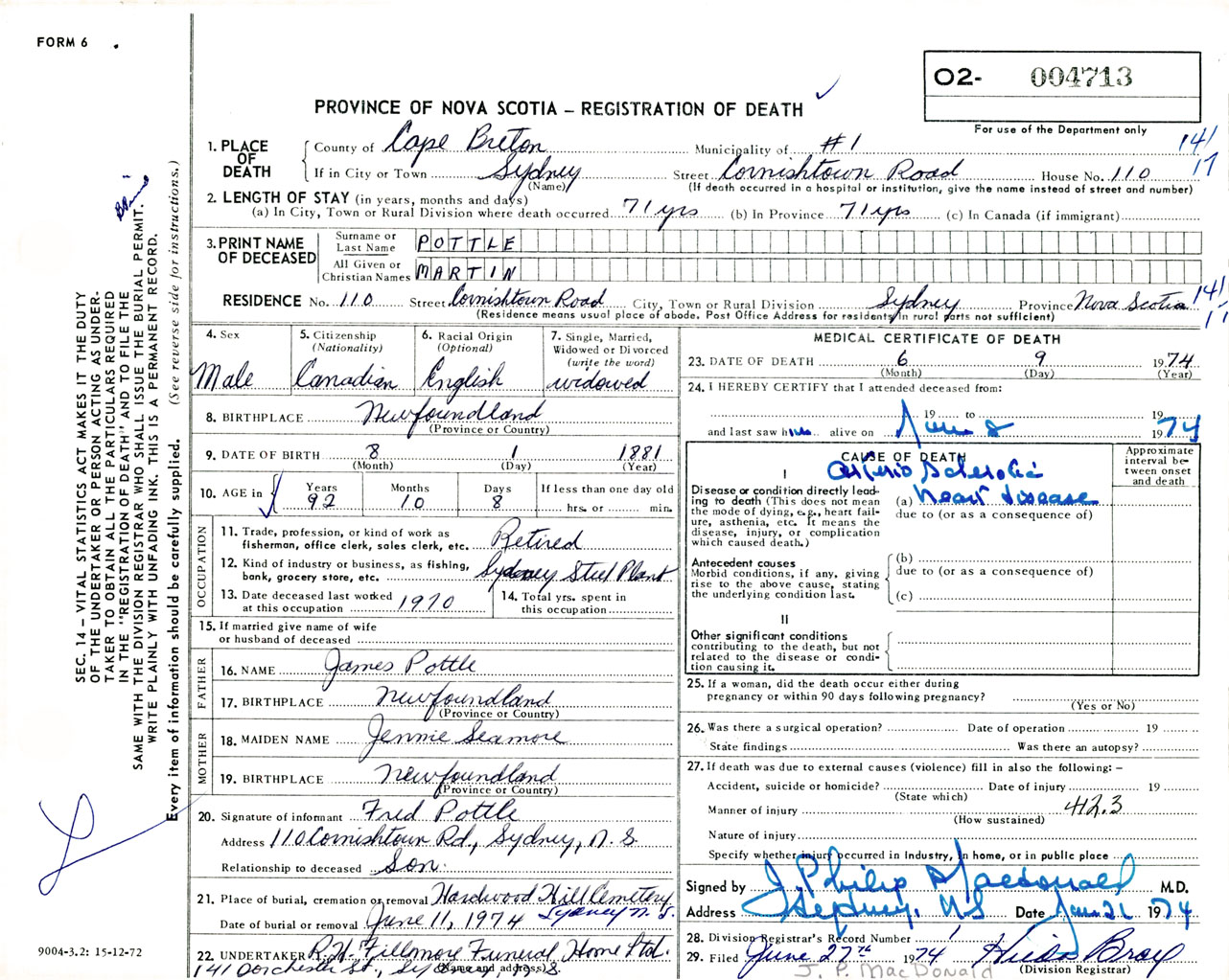 Male Death Registration: Year: 1974 number: 4713