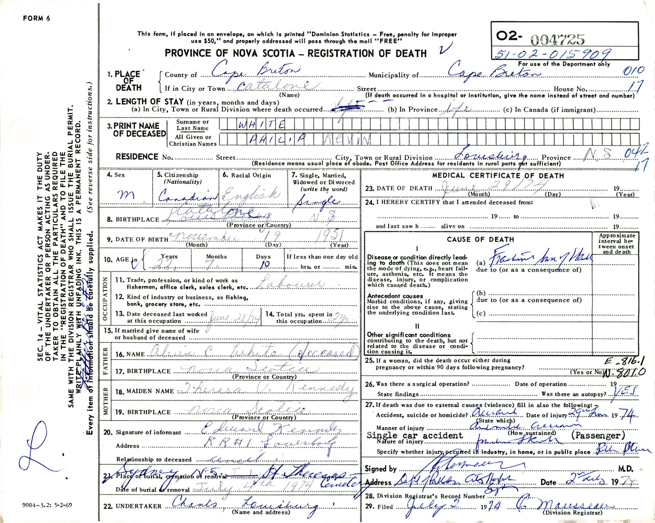Male Death Registration: Year: 1974 number: 4725