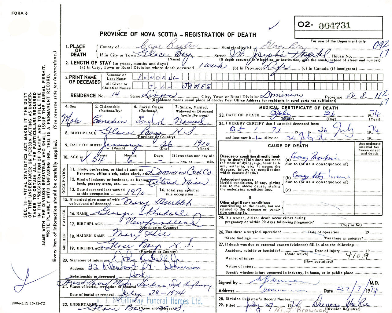 Male Death Registration: Year: 1974 number: 4731