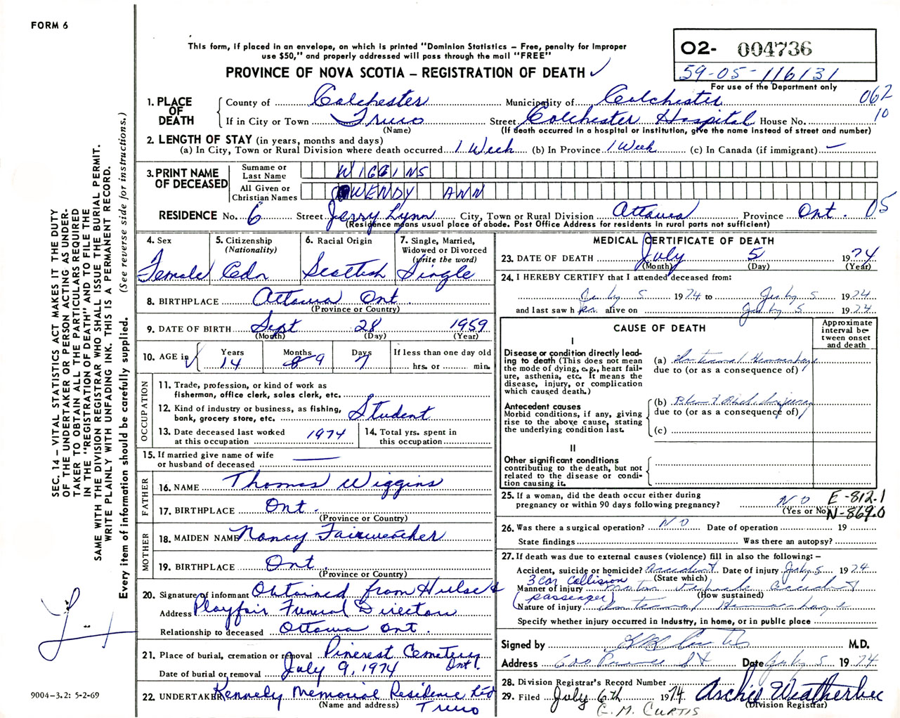 Female Death Registration: Year: 1974 number: 4736