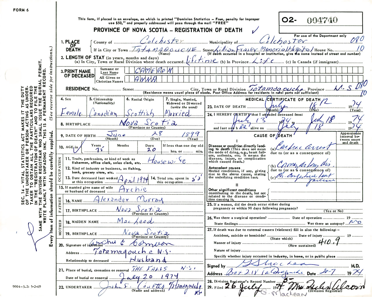 Female Death Registration: Year: 1974 number: 4740