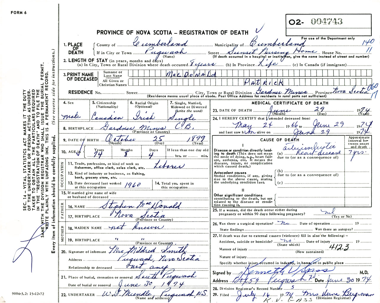 Male Death Registration: Year: 1974 number: 4743