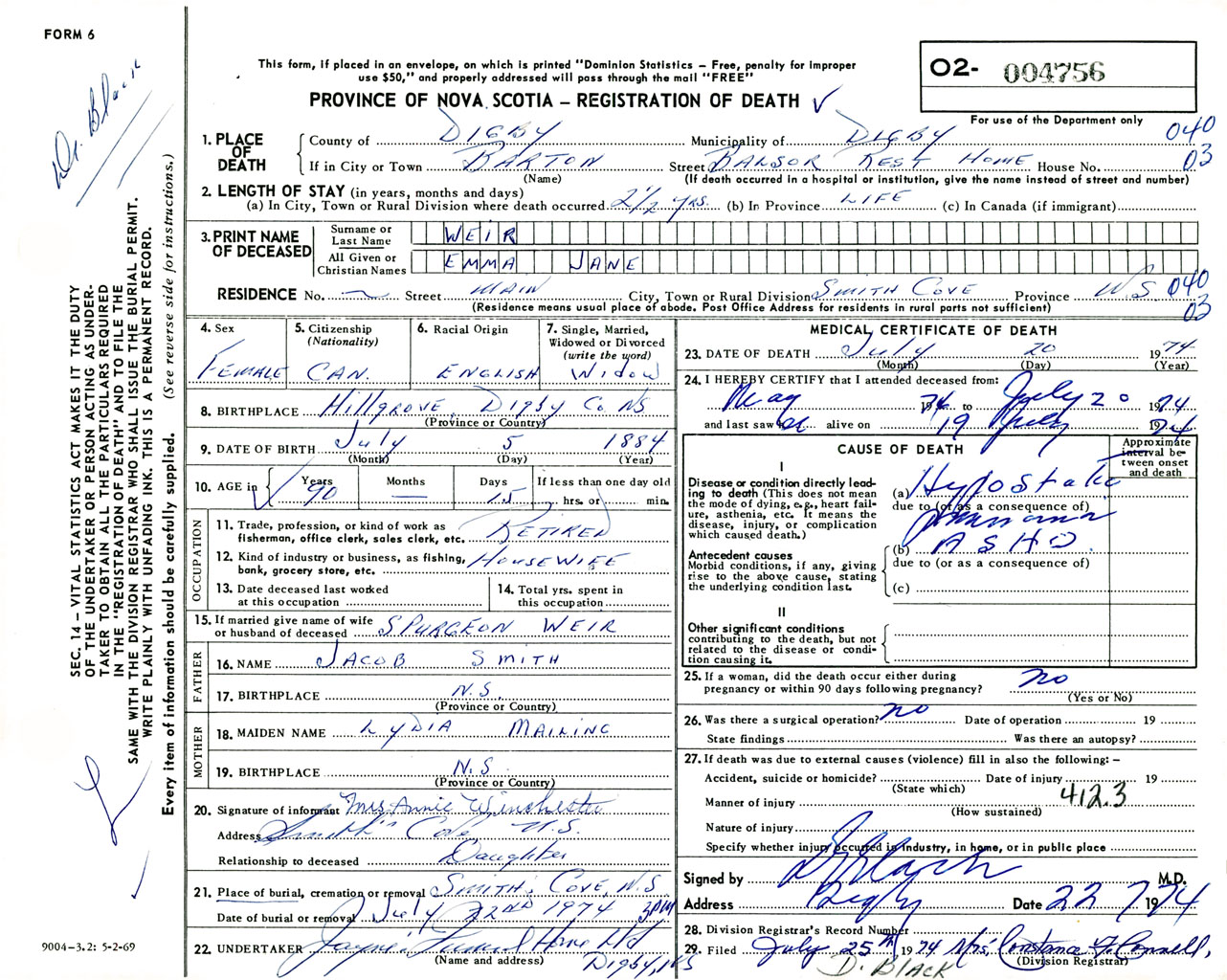 Female Death Registration: Year: 1974 number: 4756