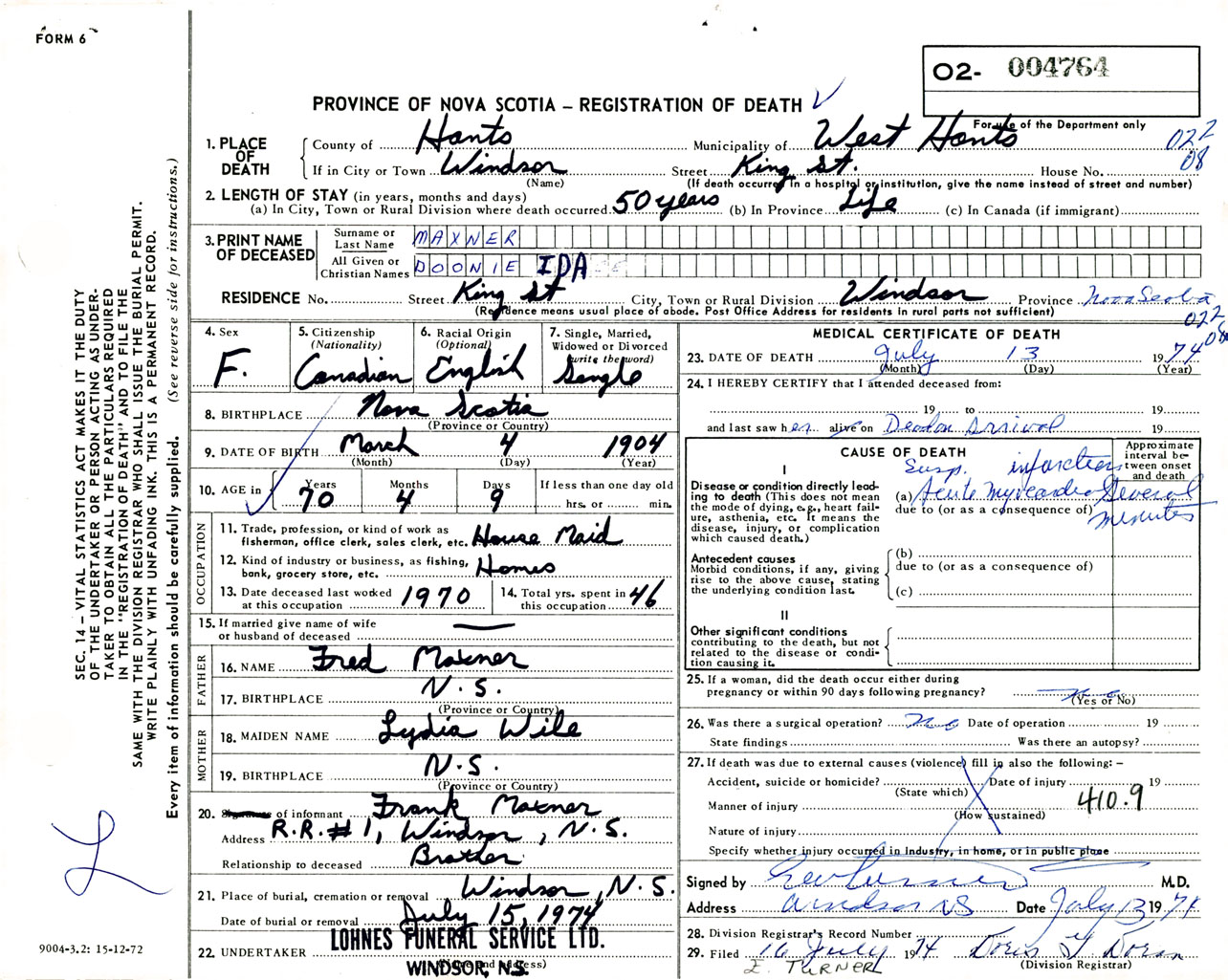 Female Death Registration: Year: 1974 number: 4764