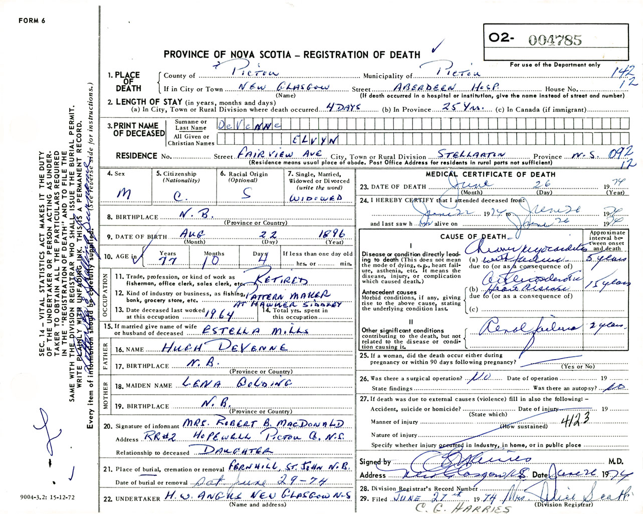 Male Death Registration: Year: 1974 number: 4785
