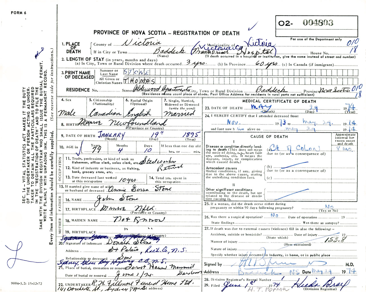 Male Death Registration: Year: 1974 number: 4803