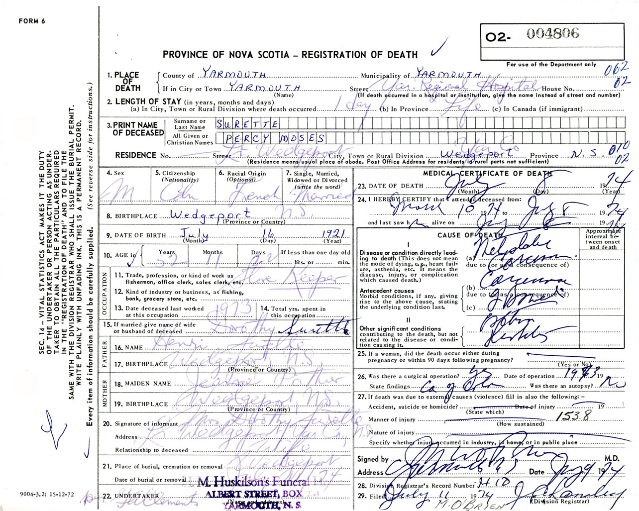 Male Death Registration: Year: 1974 number: 4806