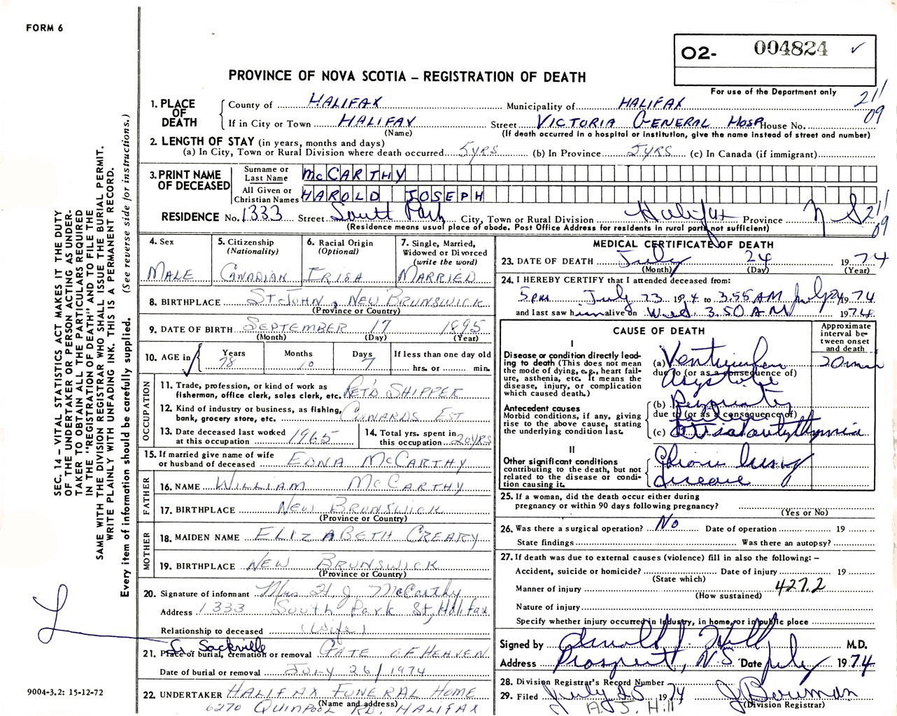 Male Death Registration: Year: 1974 number: 4824