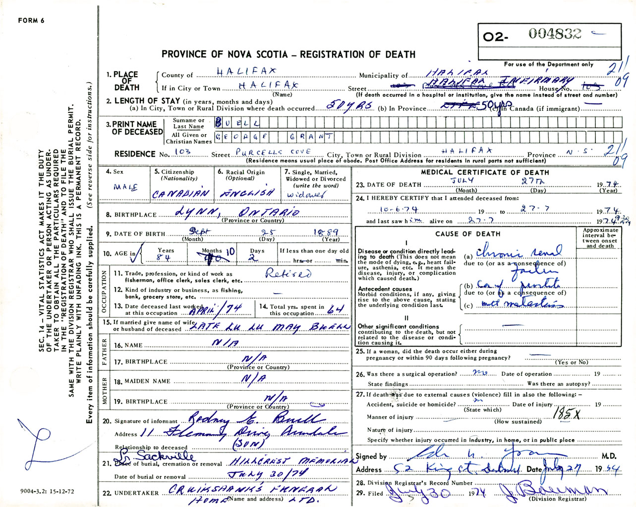 Male Death Registration: Year: 1974 number: 4832