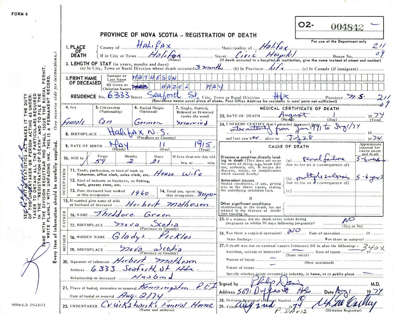 Female Death Registration: Year: 1974 number: 4842