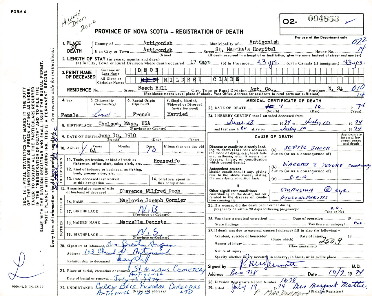 Female Death Registration: Year: 1974 number: 4853