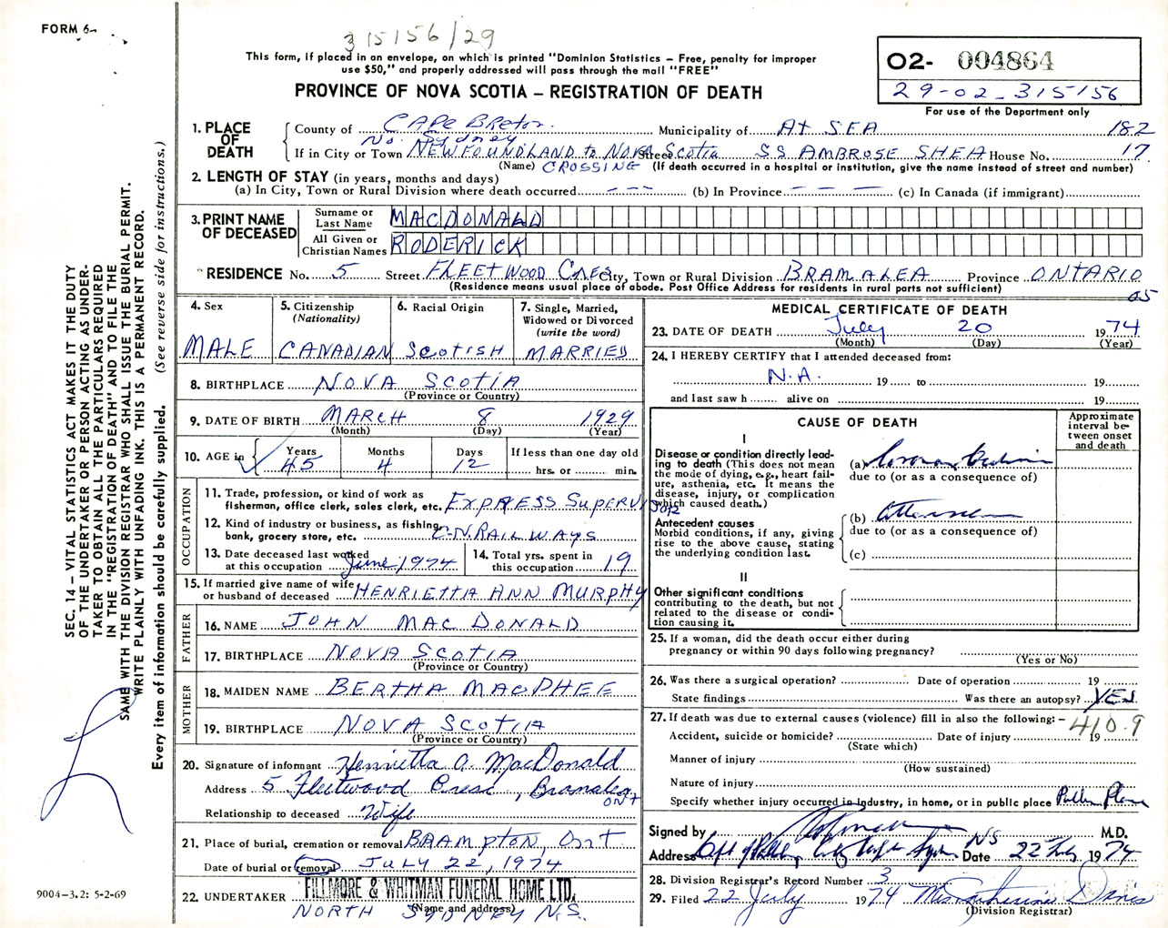 Male Death Registration: Year: 1974 number: 4864