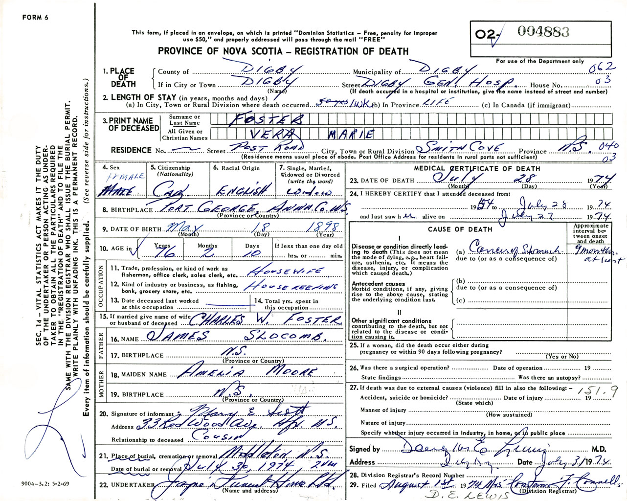 Female Death Registration: Year: 1974 number: 4883