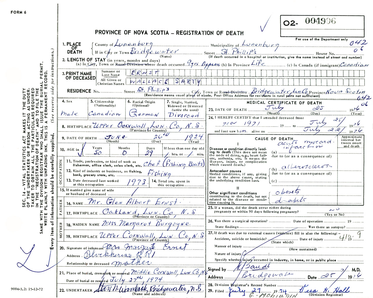 Male Death Registration: Year: 1974 number: 4906