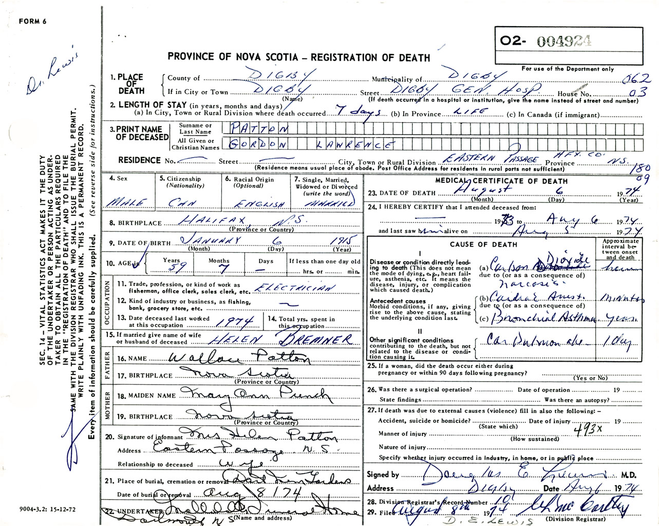 Male Death Registration: Year: 1974 number: 4924