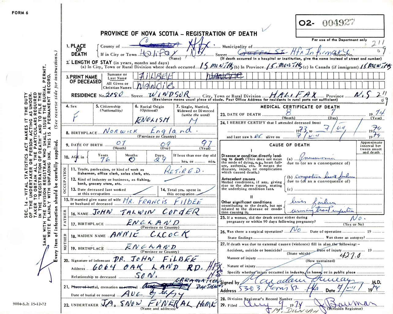 Female Death Registration: Year: 1974 number: 4927