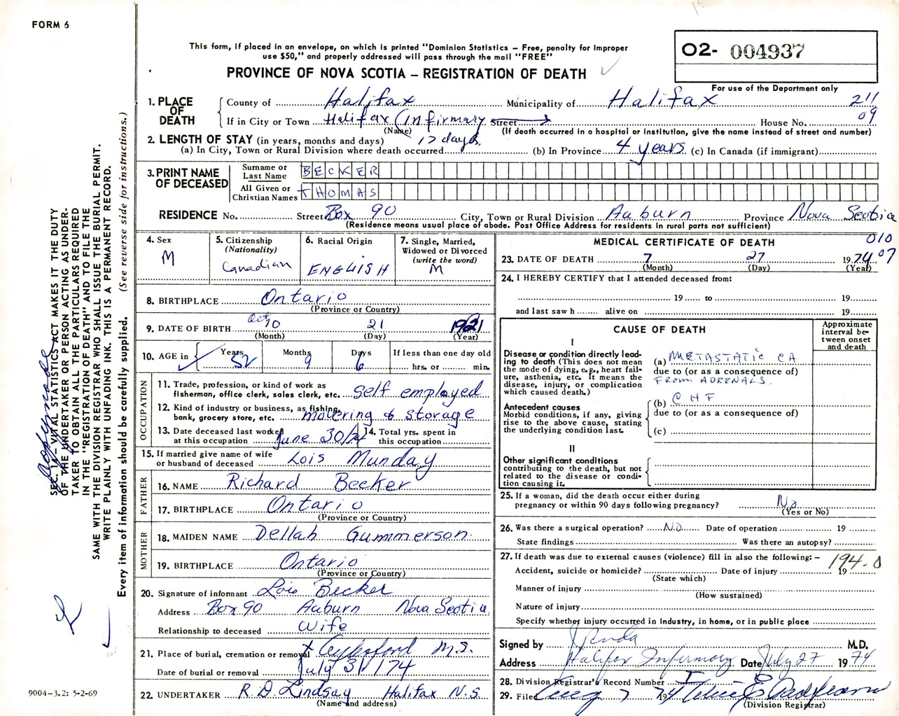 Male Death Registration: Year: 1974 number: 4937