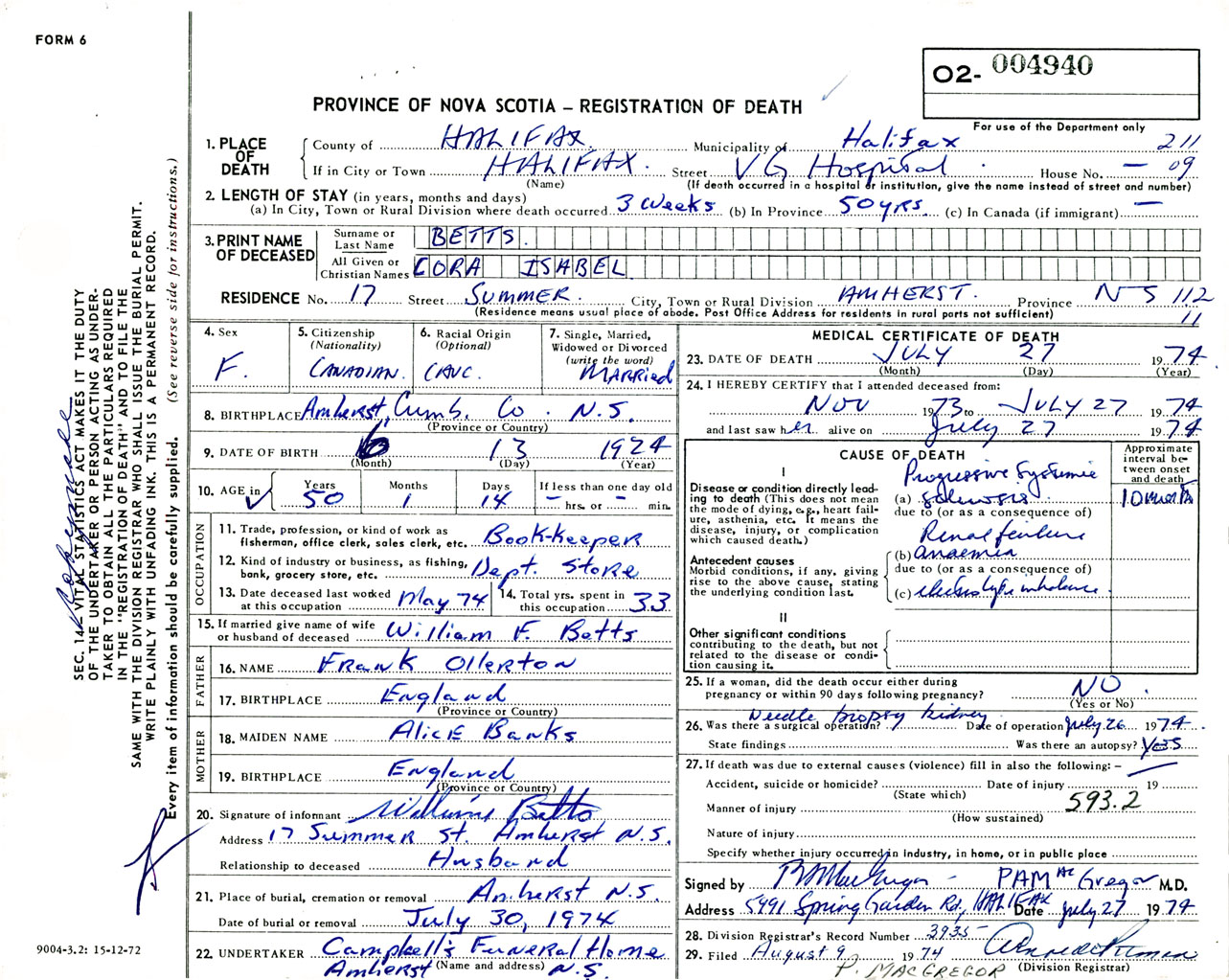 Female Death Registration: Year: 1974 number: 4940