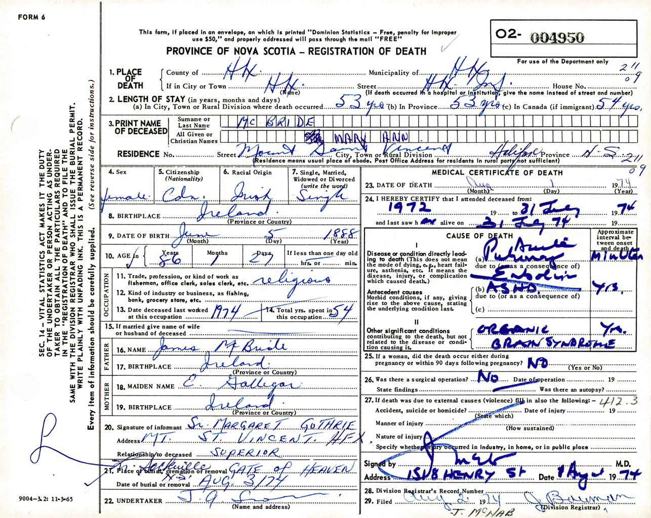 Female Death Registration: Year: 1974 number: 4950