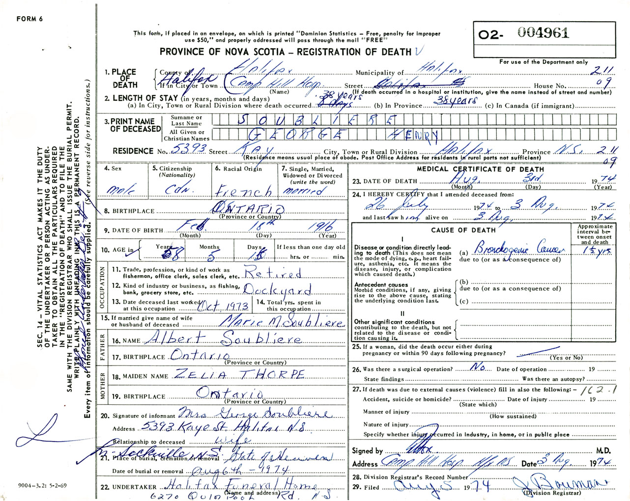 Male Death Registration: Year: 1974 number: 4961