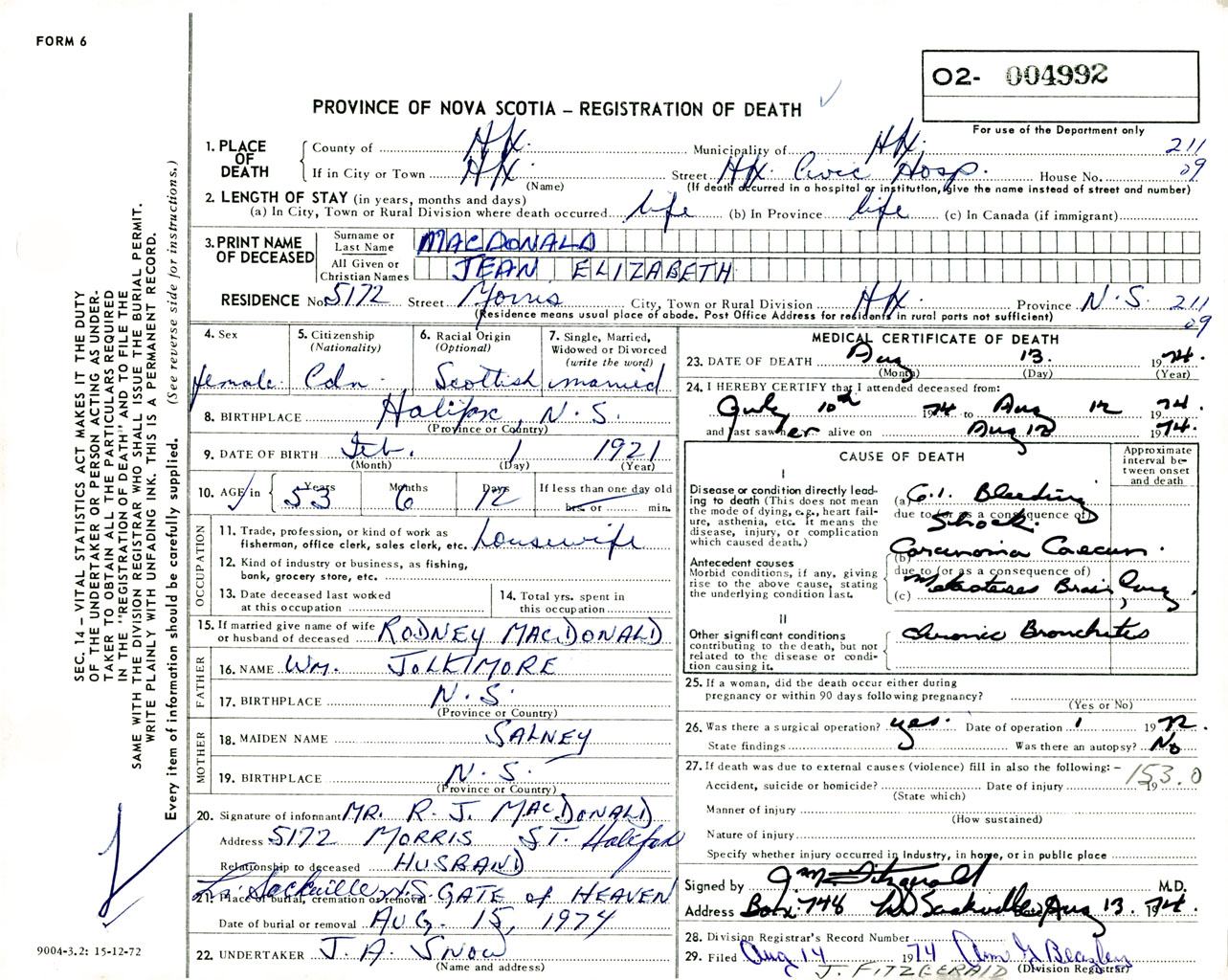 Female Death Registration: Year: 1974 number: 4992