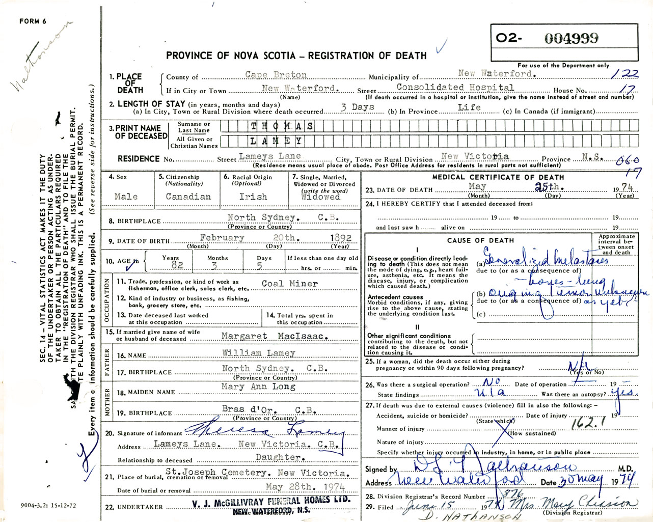 Male Death Registration: Year: 1974 number: 4999