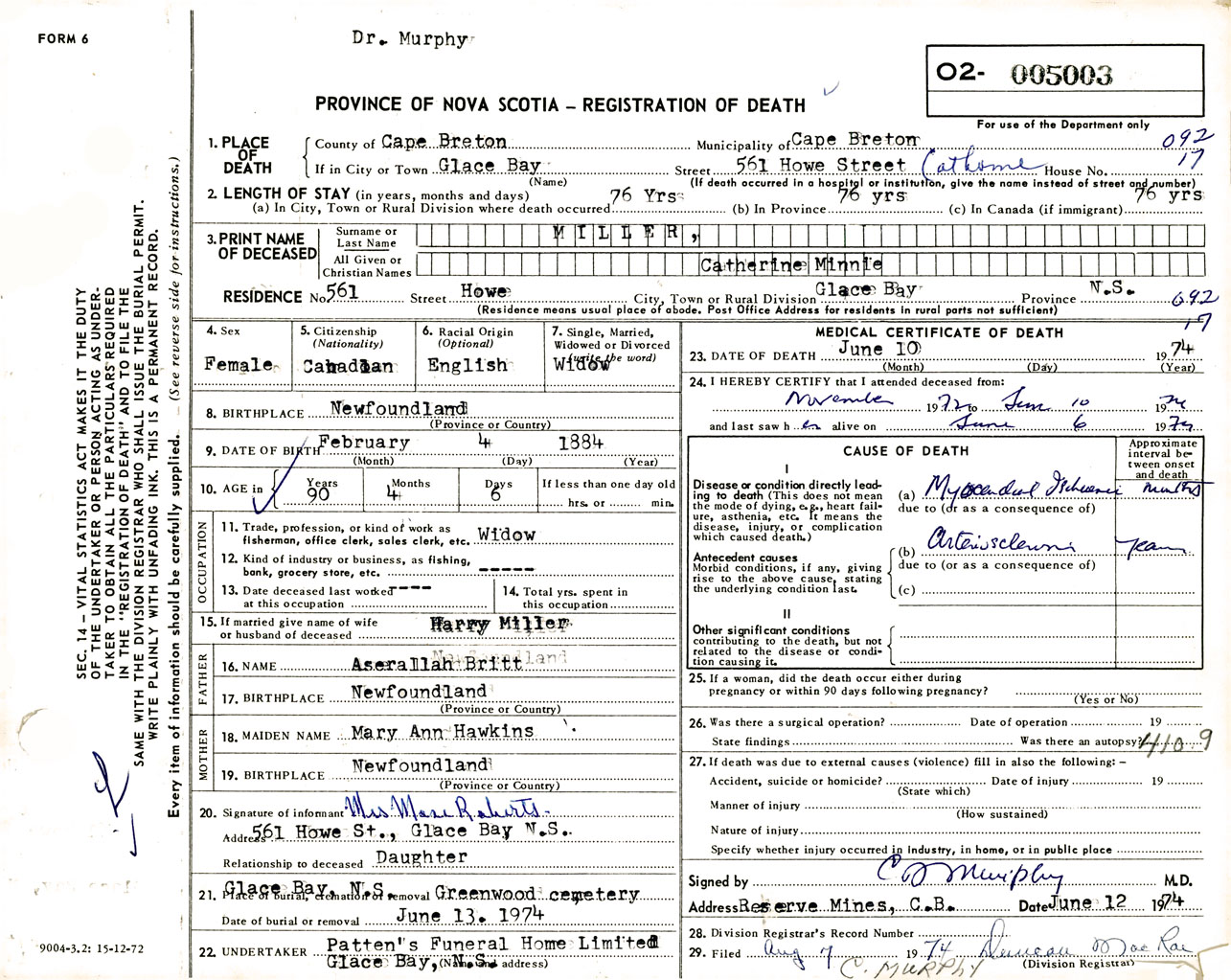 Female Death Registration: Year: 1974 number: 5003