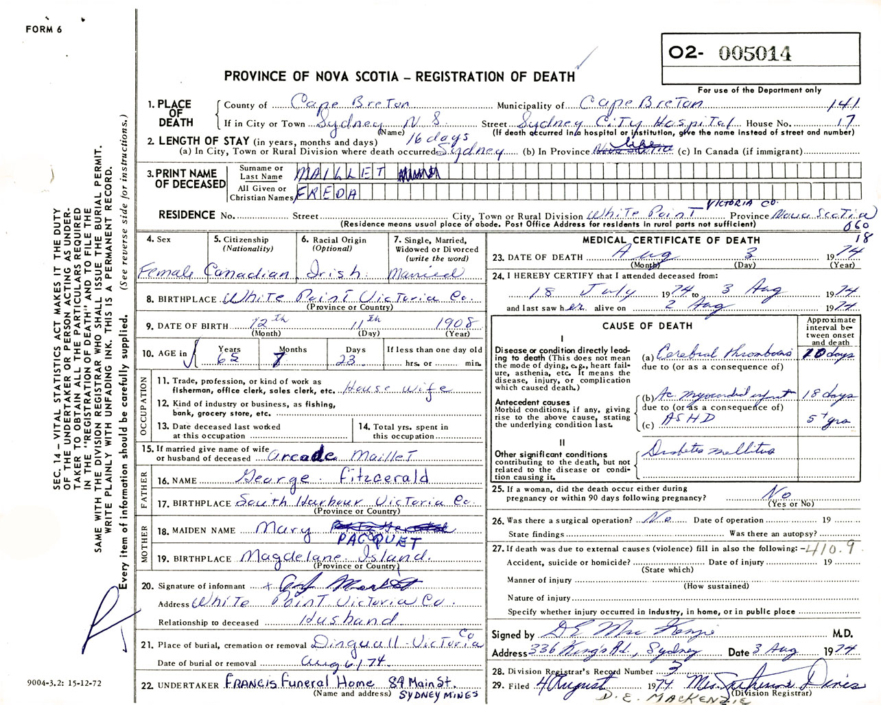 Female Death Registration: Year: 1974 number: 5014