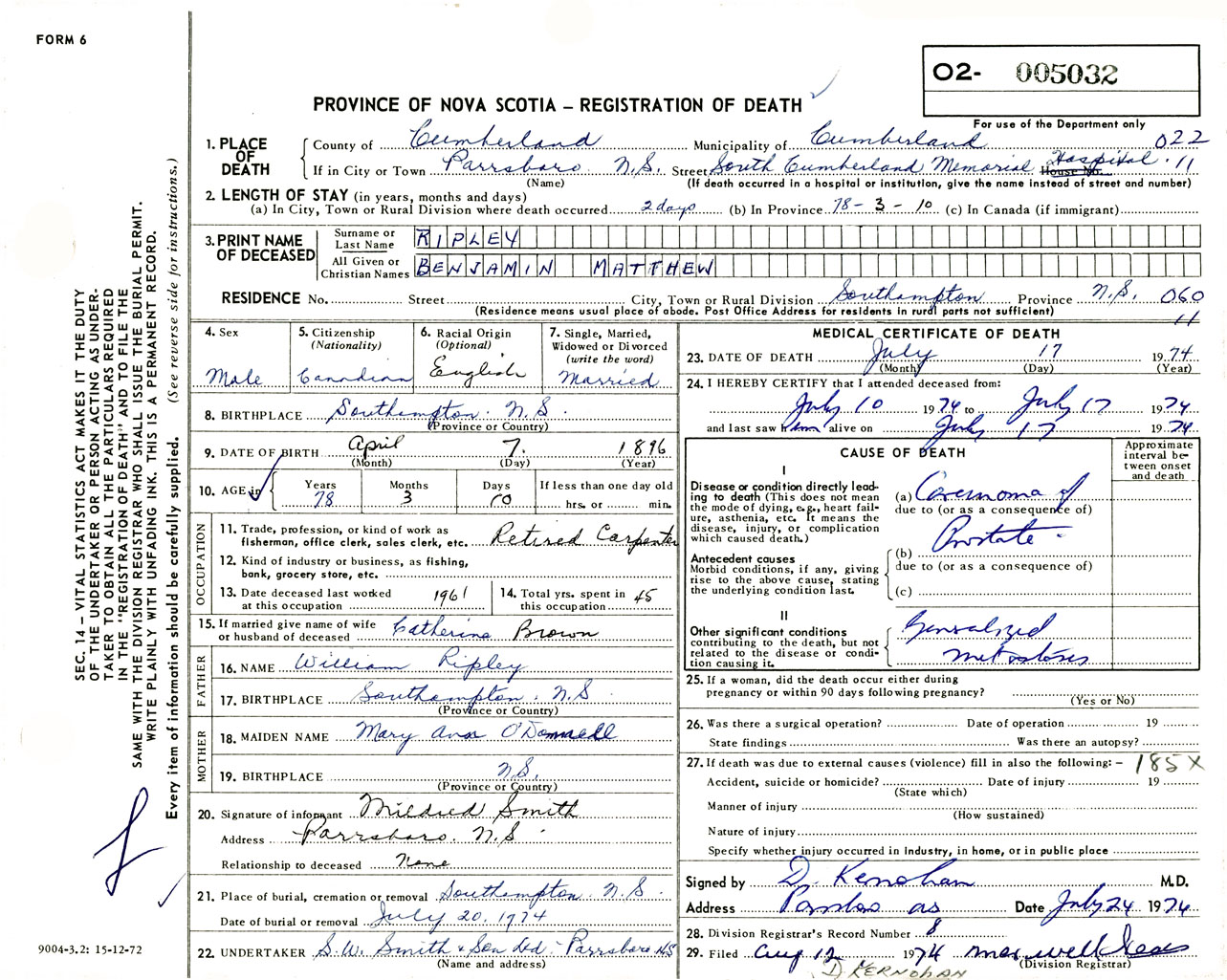 Male Death Registration: Year: 1974 number: 5032