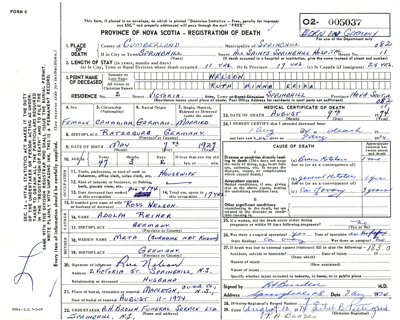 Female Death Registration: Year: 1974 number: 5037