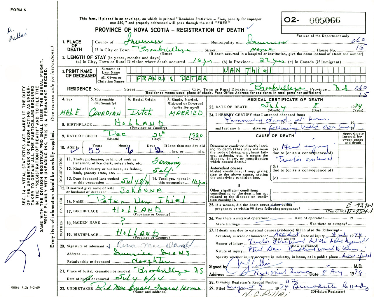 Male Death Registration: Year: 1974 number: 5066
