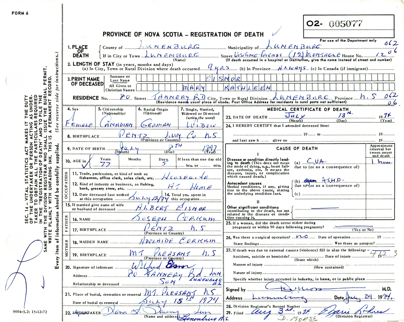 Female Death Registration: Year: 1974 number: 5077