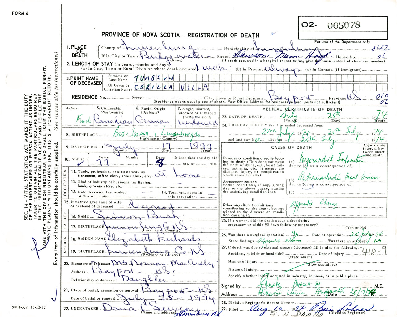 Female Death Registration: Year: 1974 number: 5078
