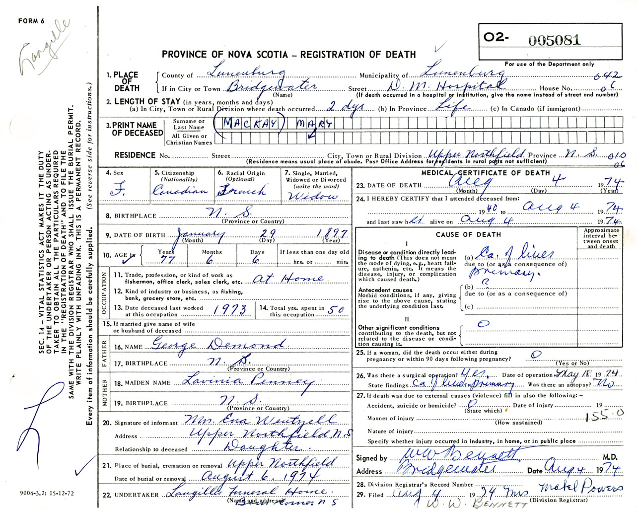 Female Death Registration: Year: 1974 number: 5081