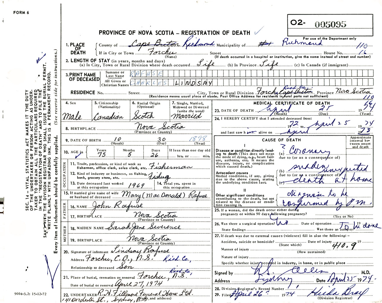 Male Death Registration: Year: 1974 number: 5095