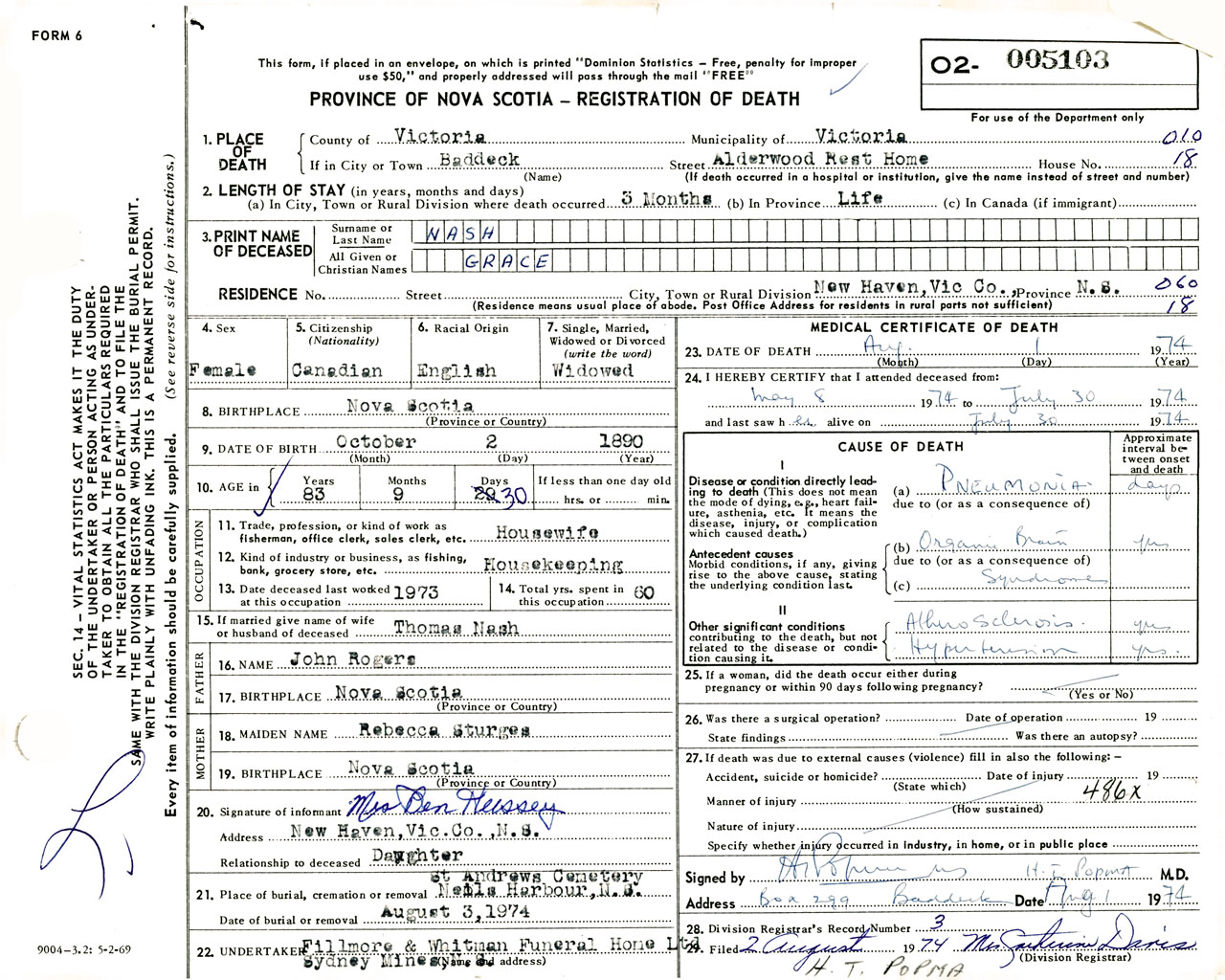 Female Death Registration: Year: 1974 number: 5103