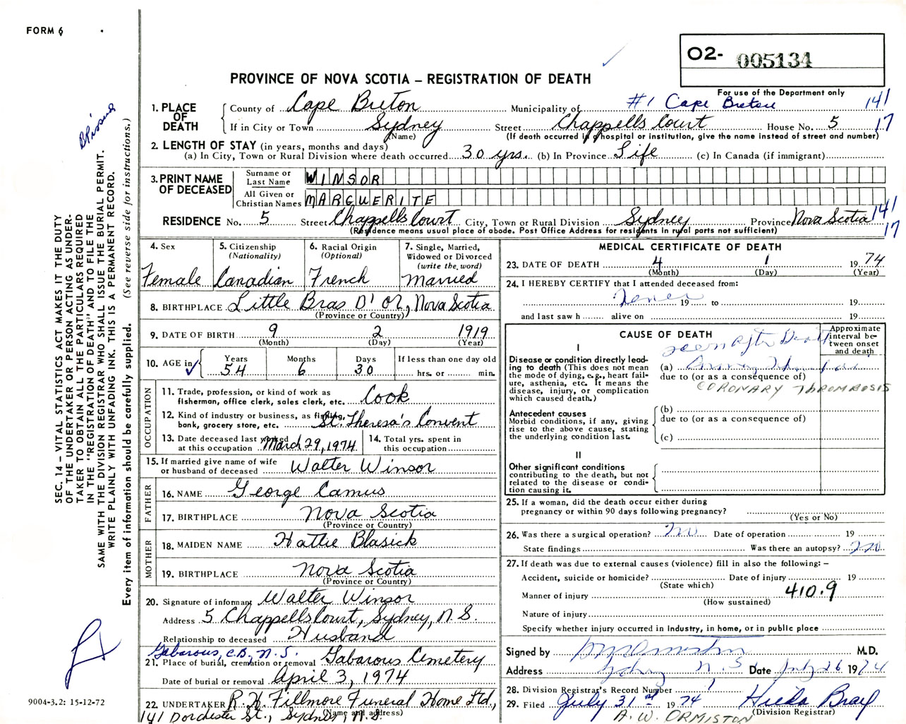 Female Death Registration: Year: 1974 number: 5134