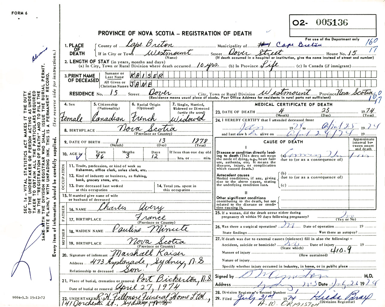 Female Death Registration: Year: 1974 number: 5136
