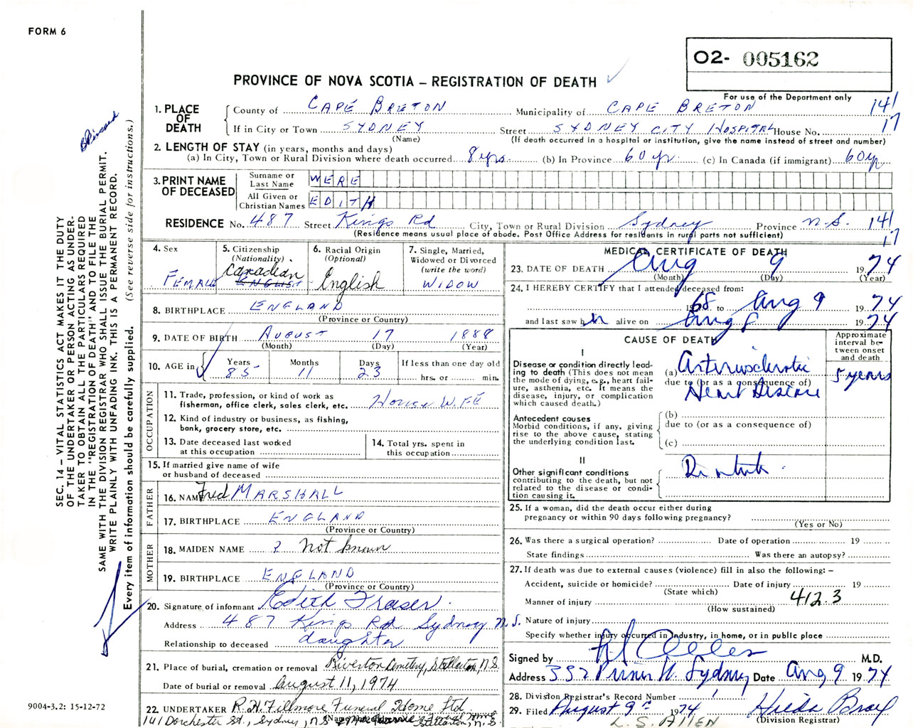 Female Death Registration: Year: 1974 number: 5162