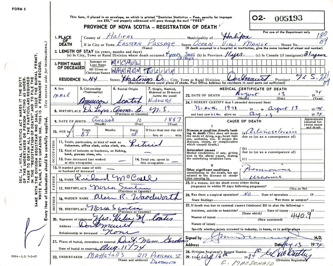 Male Death Registration: Year: 1974 number: 5193