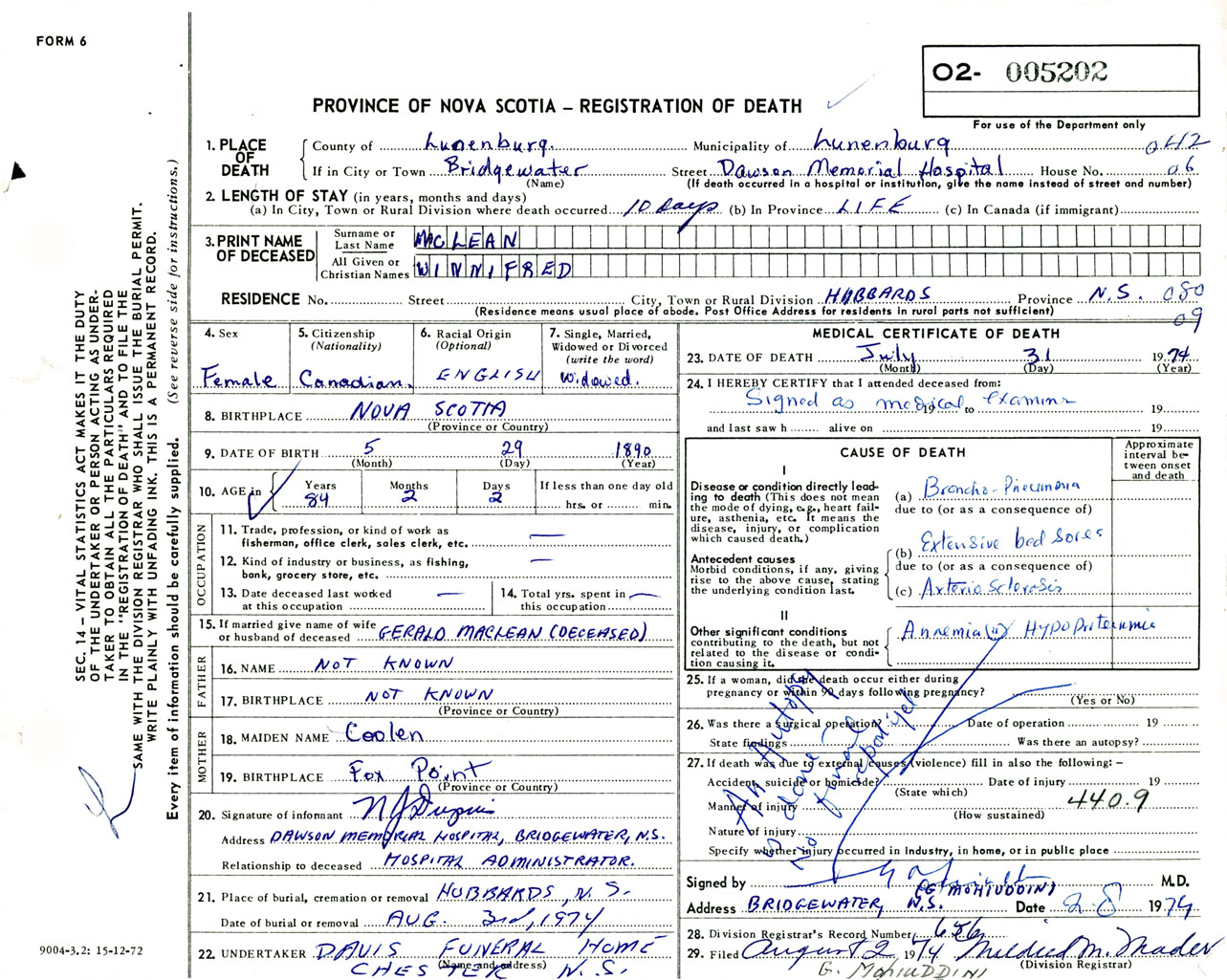Female Death Registration: Year: 1974 number: 5202