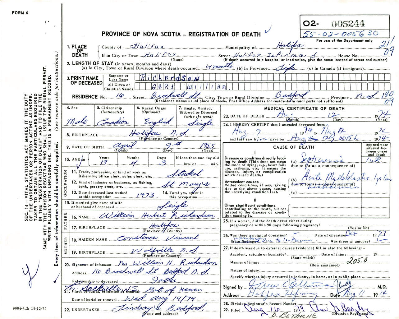 Male Death Registration: Year: 1974 number: 5244