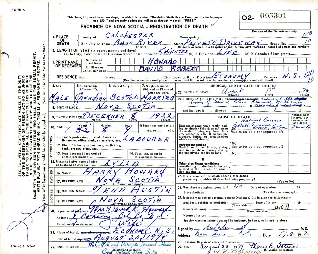 Male Death Registration: Year: 1974 number: 5301