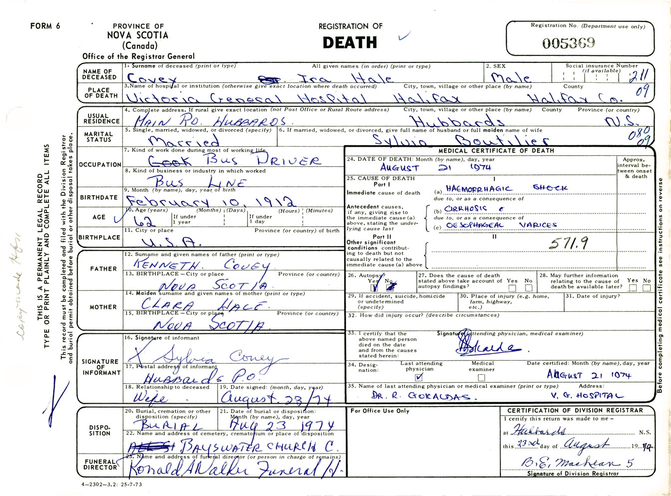Male Death Registration: Year: 1974 number: 5369