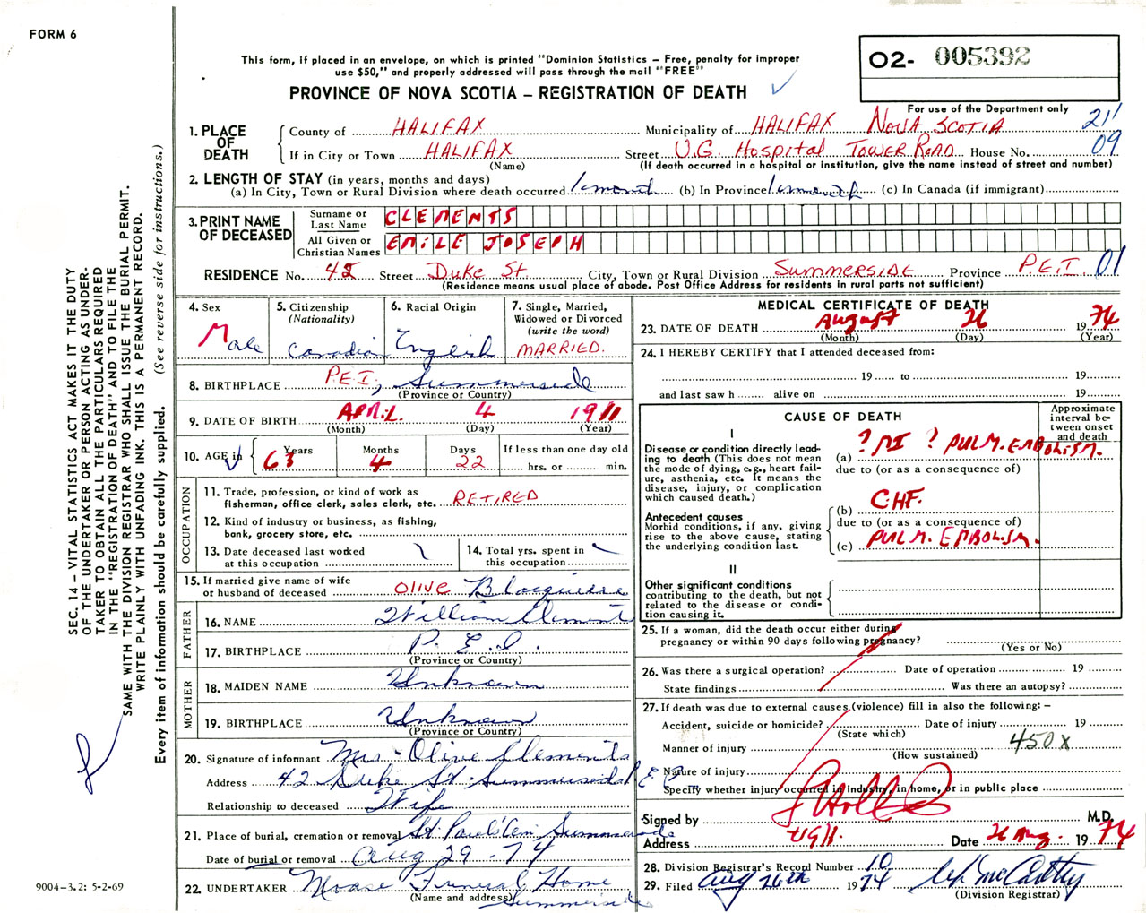Male Death Registration: Year: 1974 number: 5392