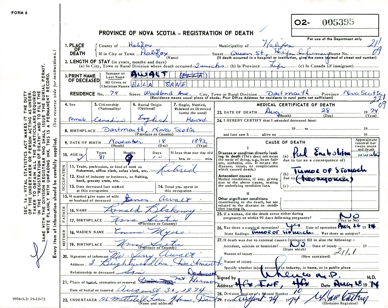 Female Death Registration: Year: 1974 number: 5395