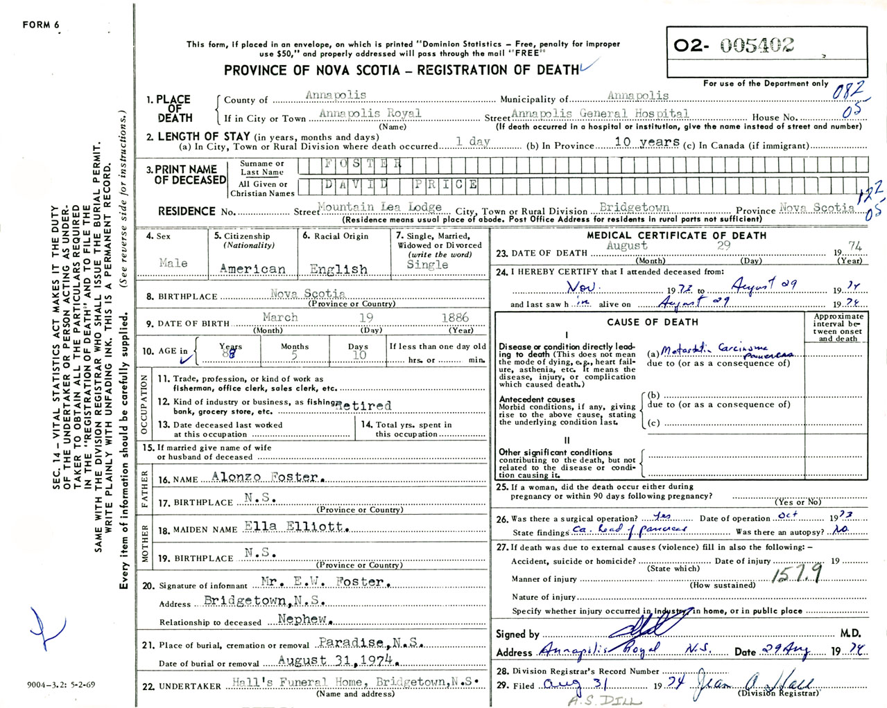 Male Death Registration: Year: 1974 number: 5402