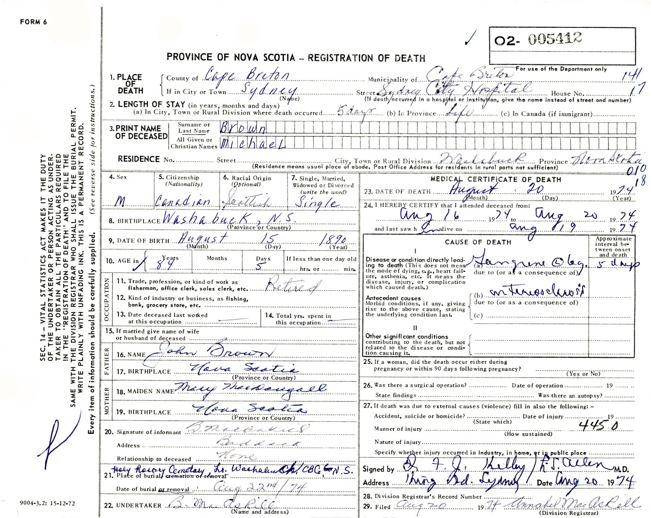 Male Death Registration: Year: 1974 number: 5412